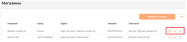 В данном списке при нажатии на выделенные значки возможно посмотреть QR-код магазина, отредактировать информацию о нем или удалить магазин.